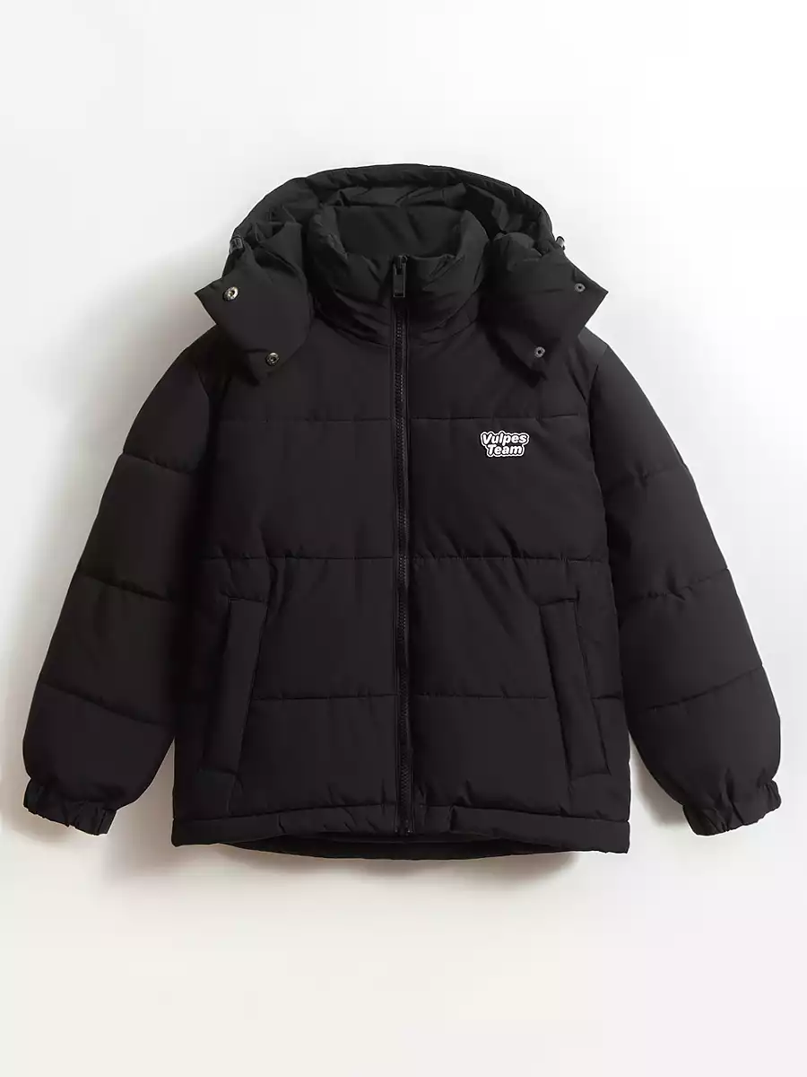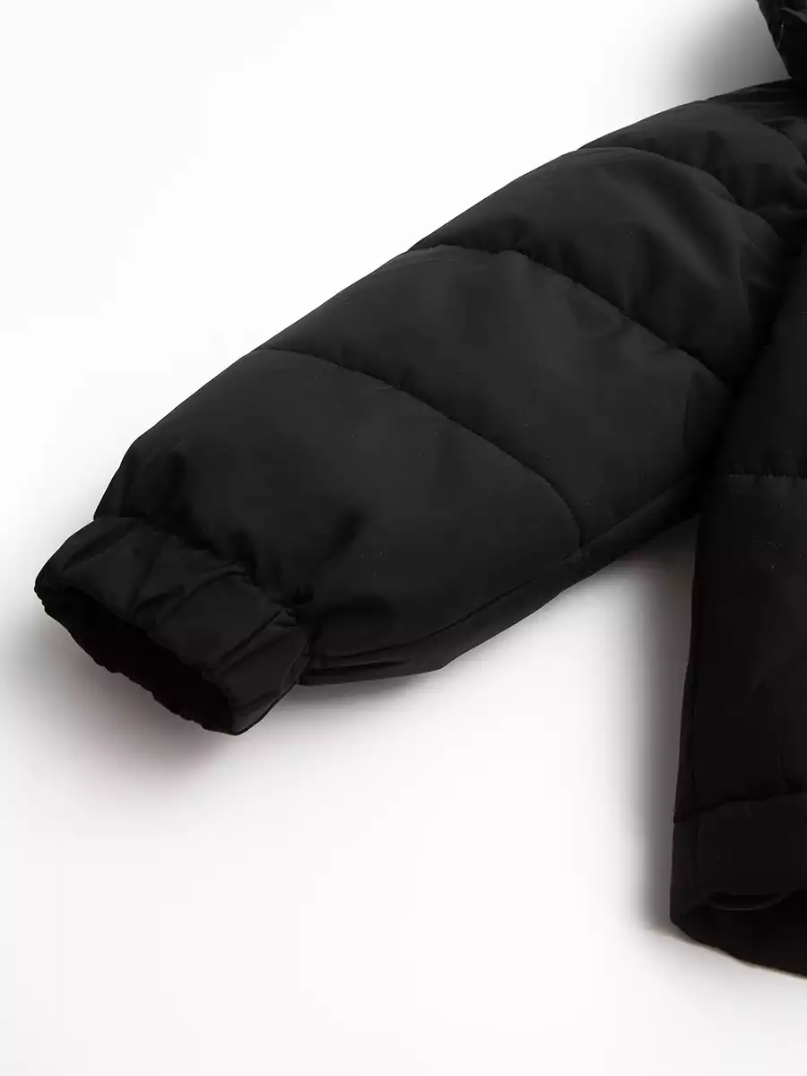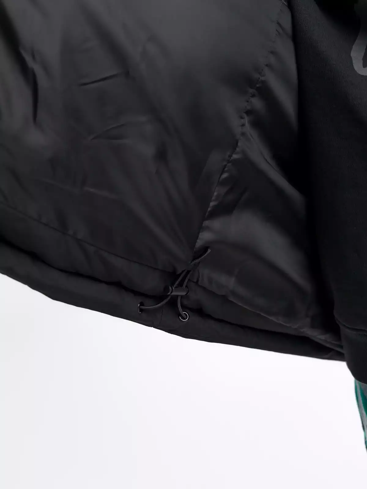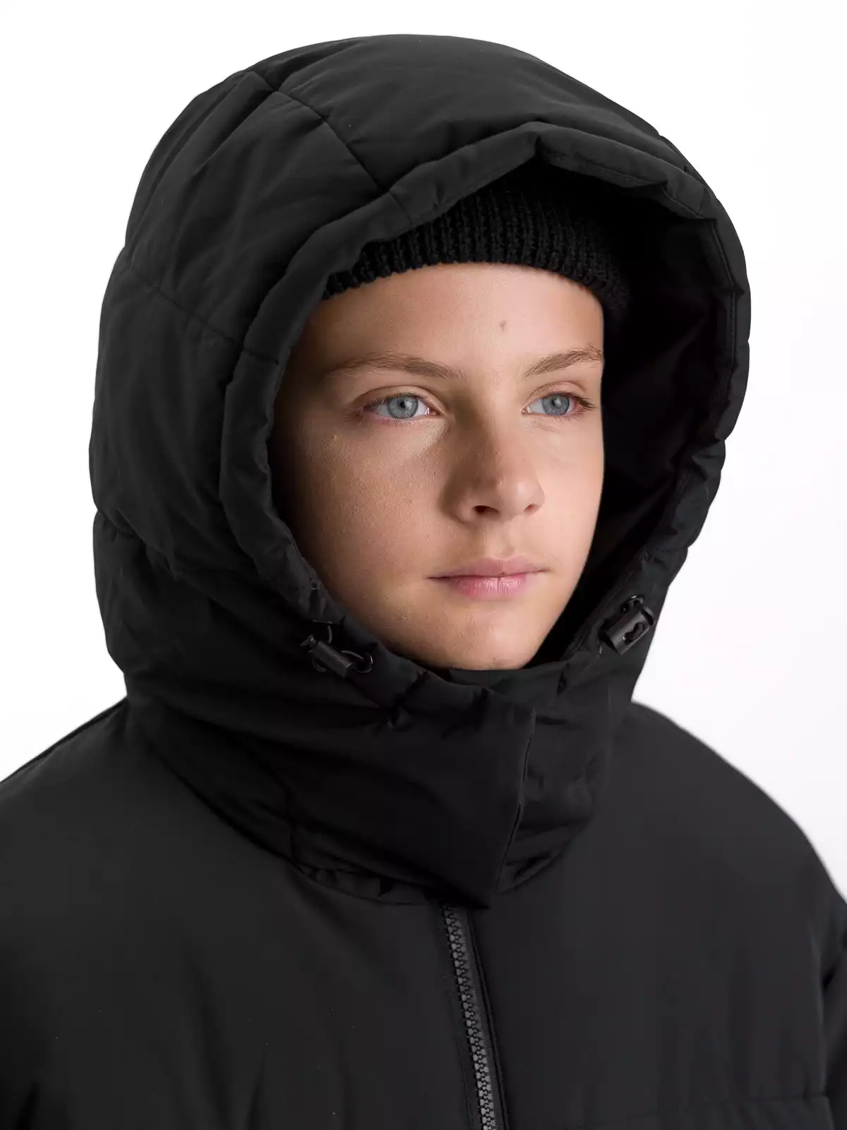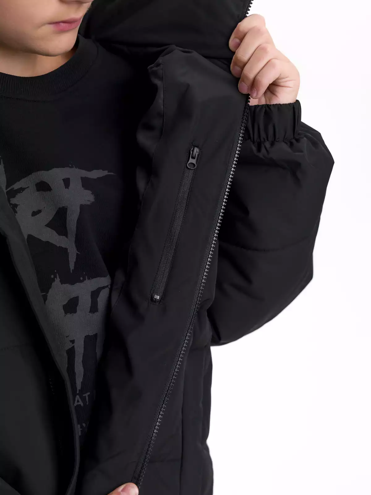 - Съёмный капюшон на кнопках с дополнительной фиксацией на кнопки в области горловины, по краю регулируемая утяжка на резину-шнур с фиксаторами;