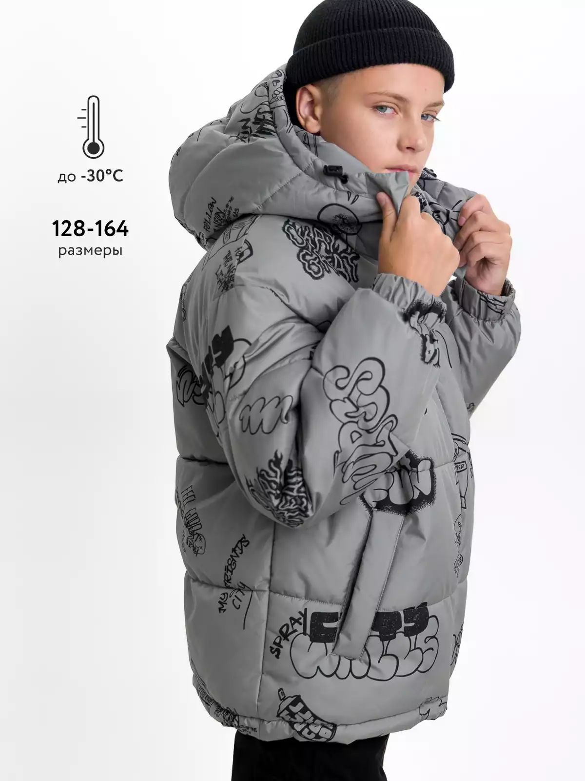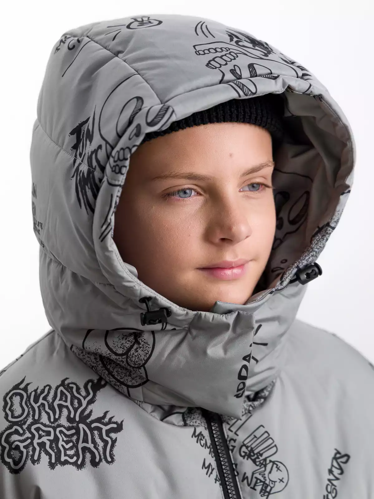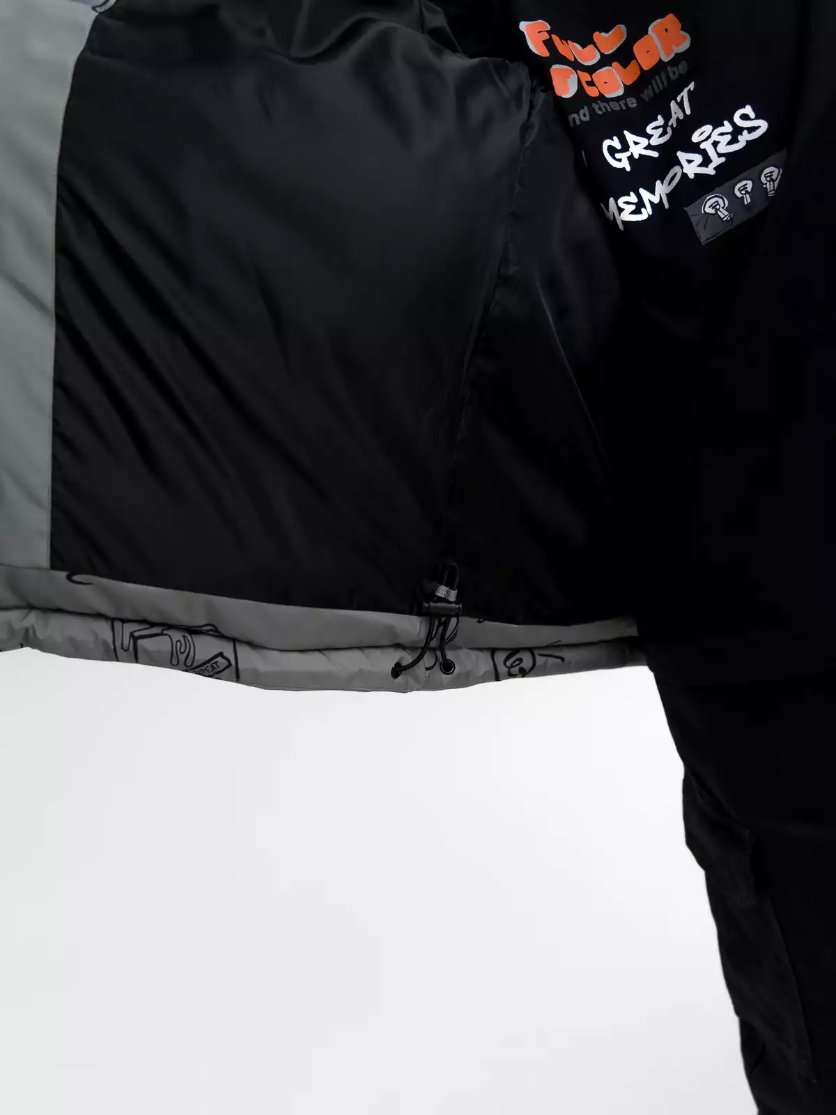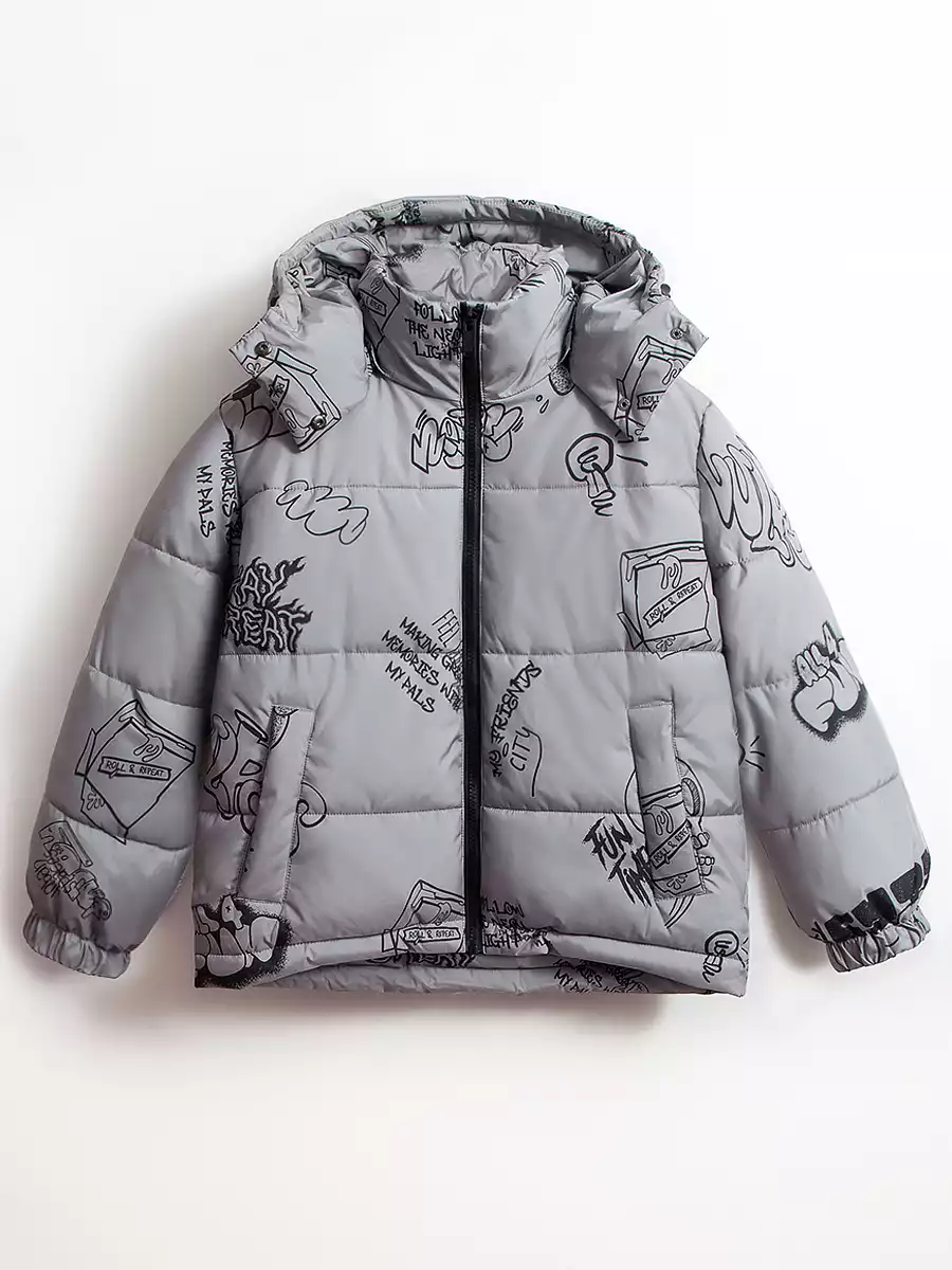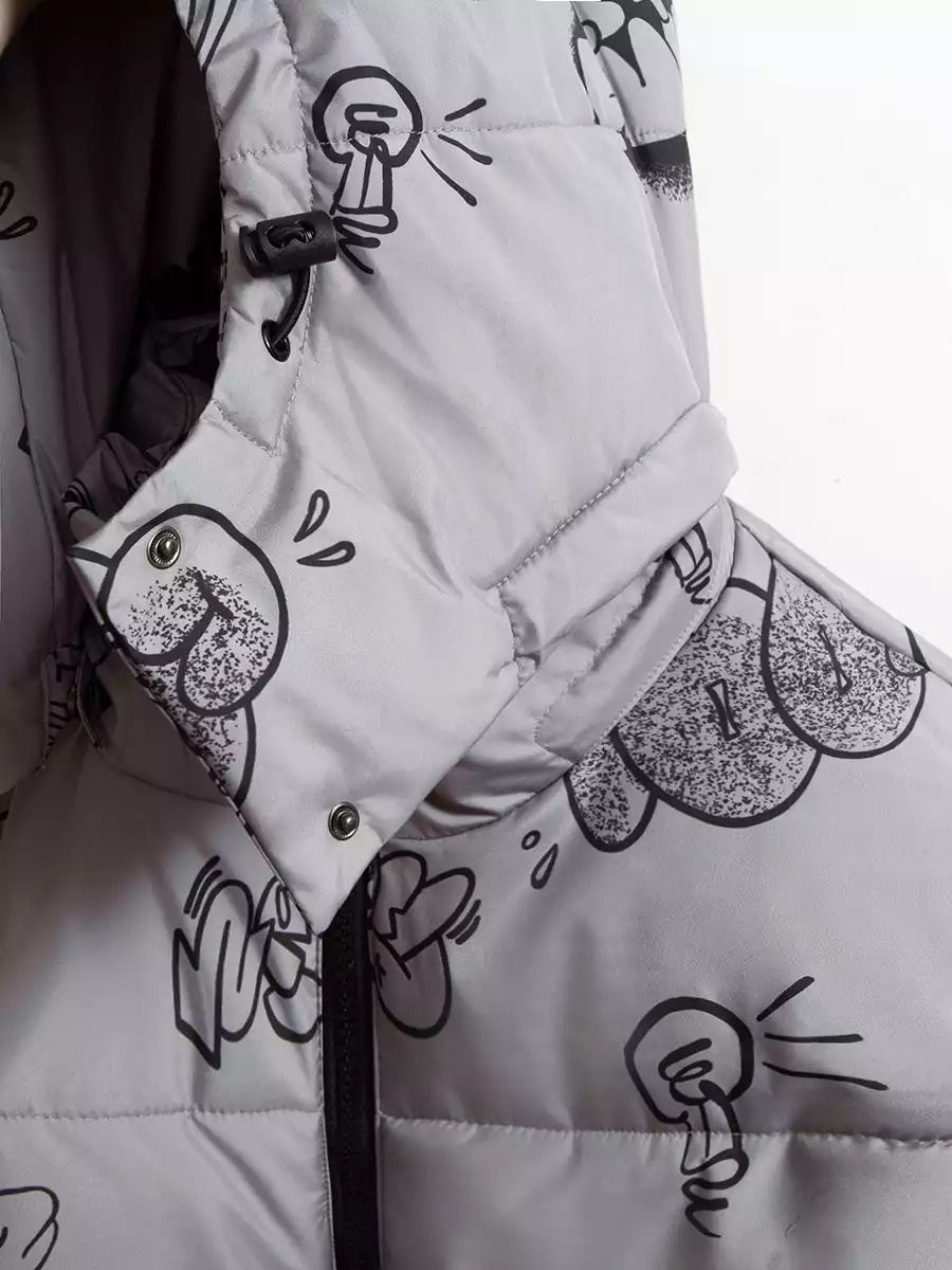 - Съёмный капюшон на кнопках с дополнительной фиксацией на кнопки в области горловины, по краю регулируемая утяжка на резину-шнур с фиксаторами;
