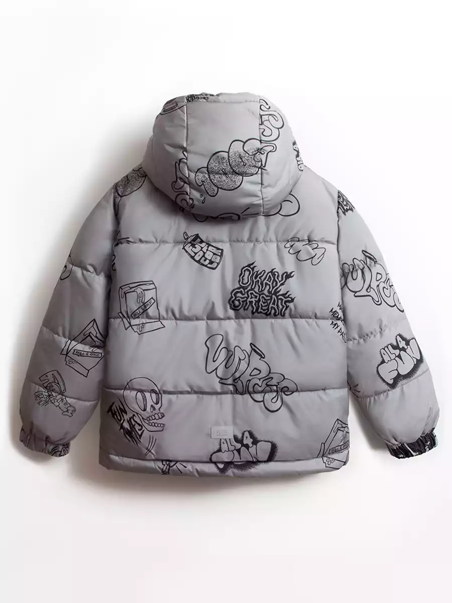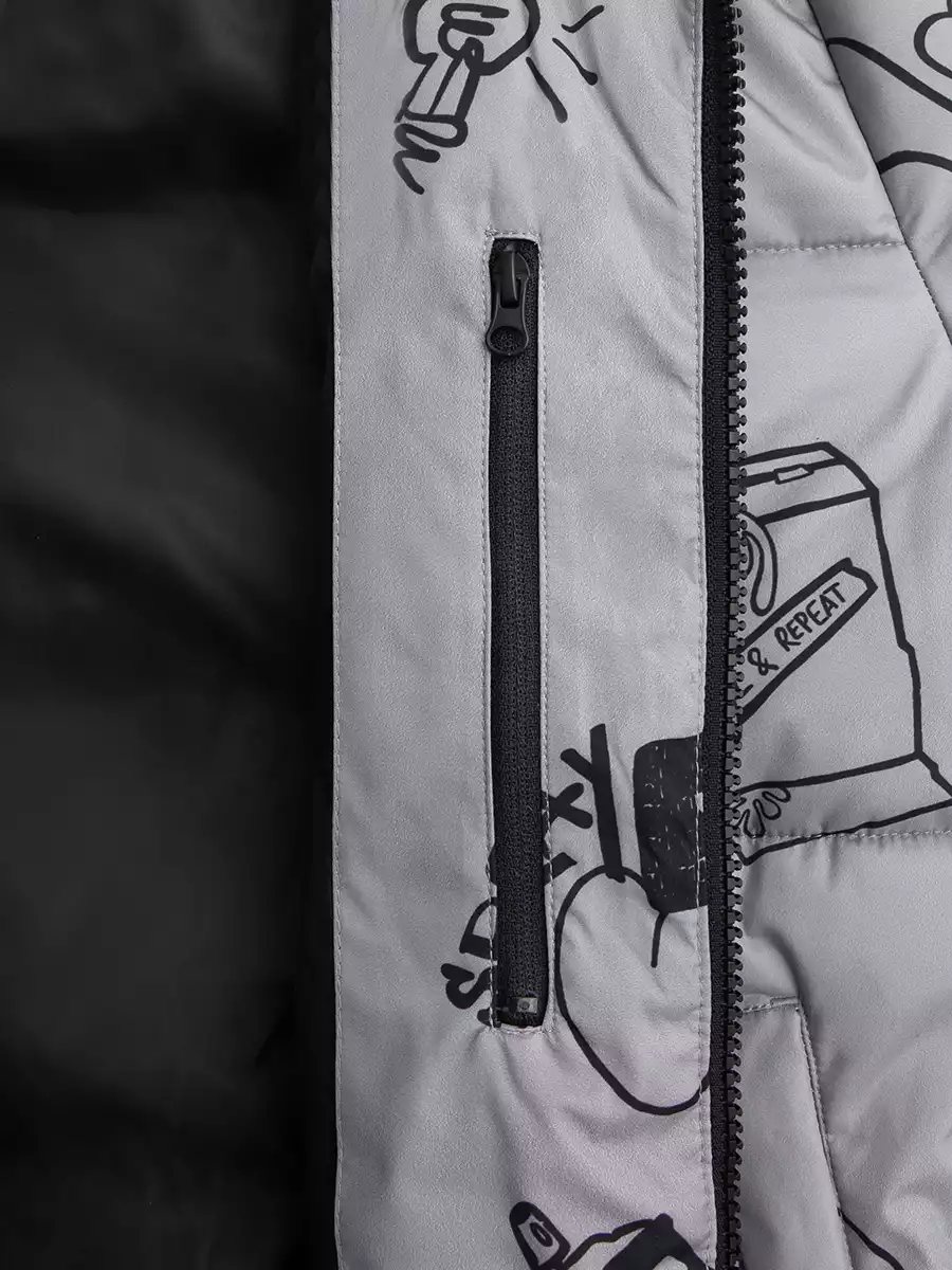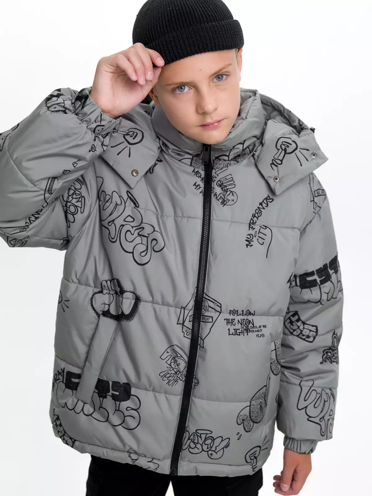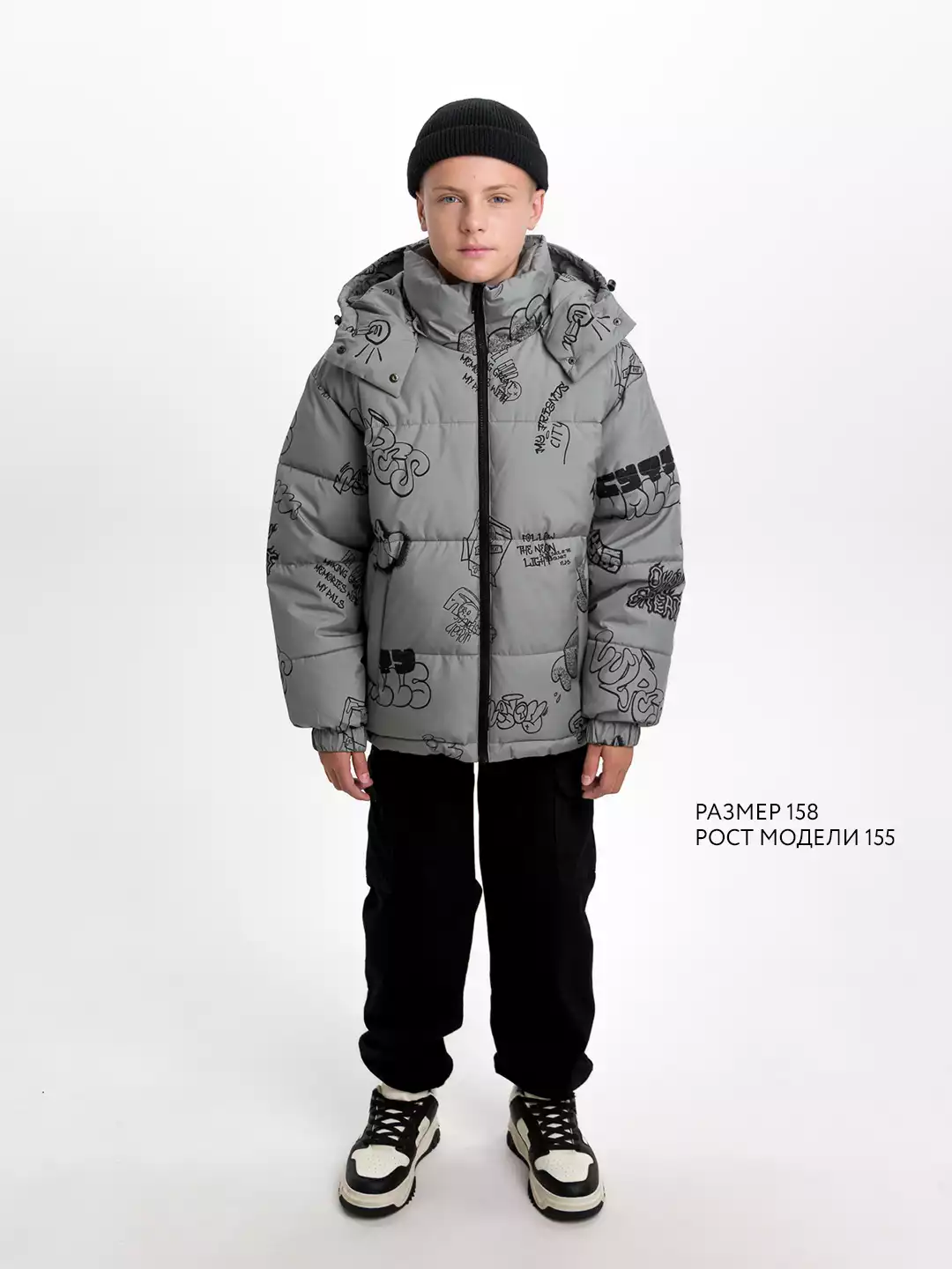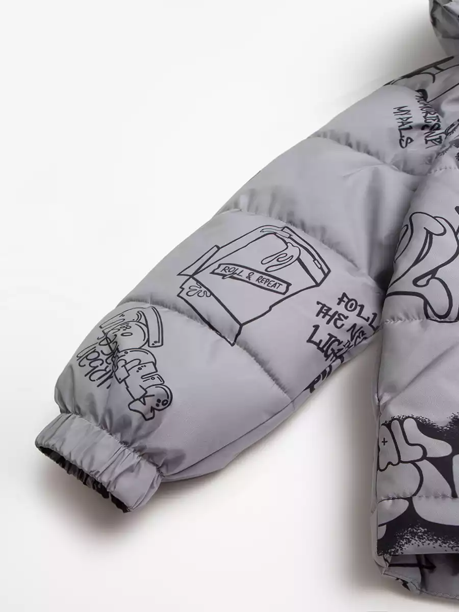 - Съёмный капюшон на кнопках с дополнительной фиксацией на кнопки в области горловины, по краю регулируемая утяжка на резину-шнур с фиксаторами;