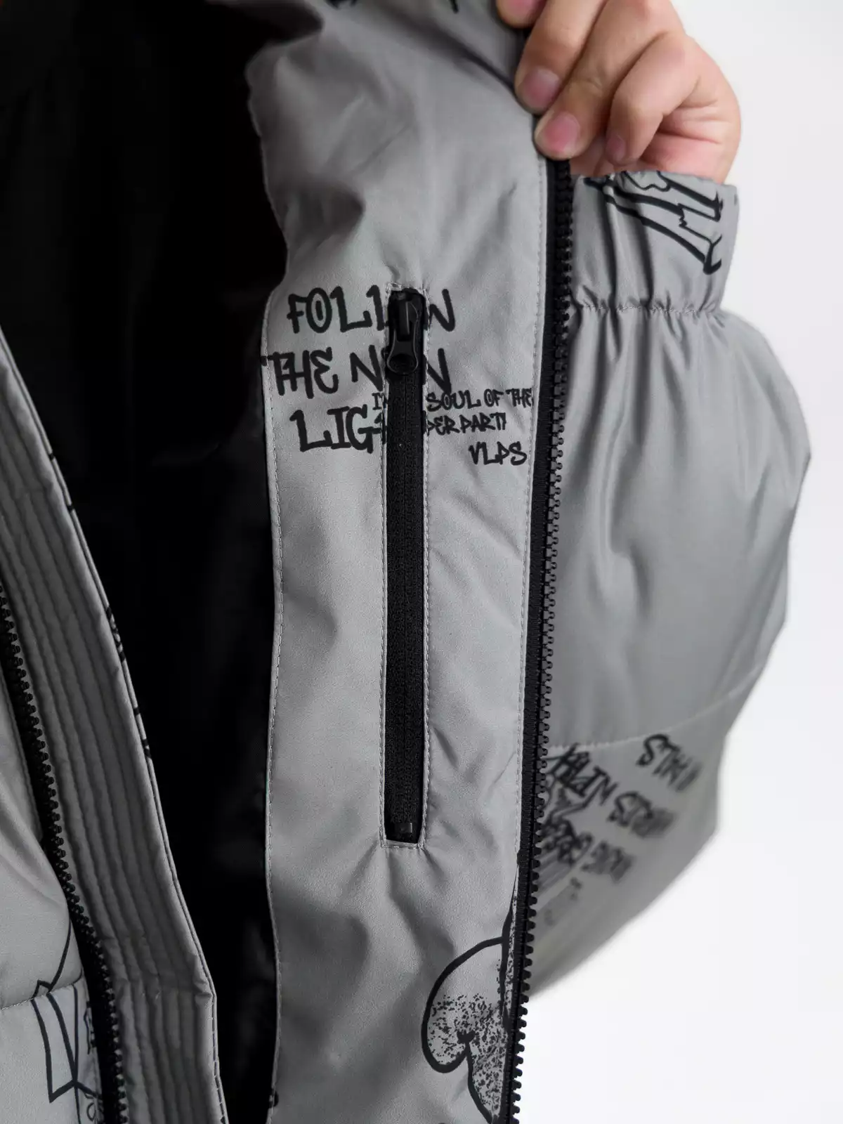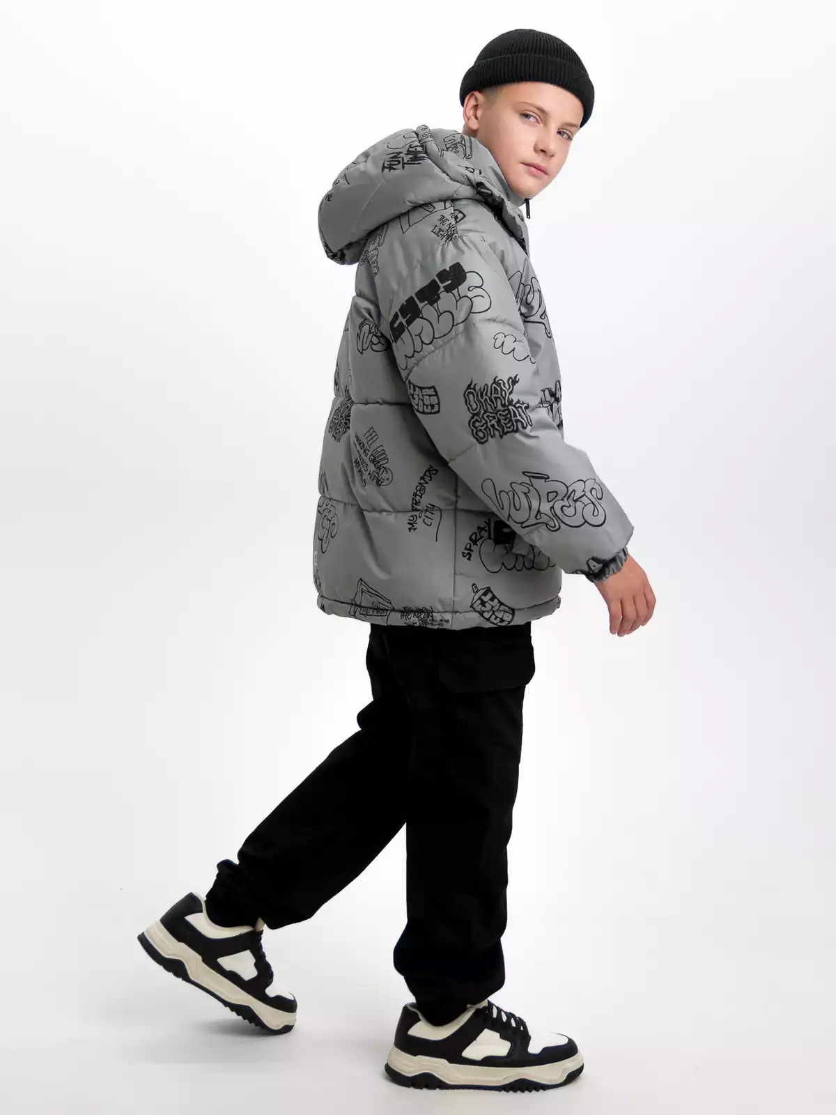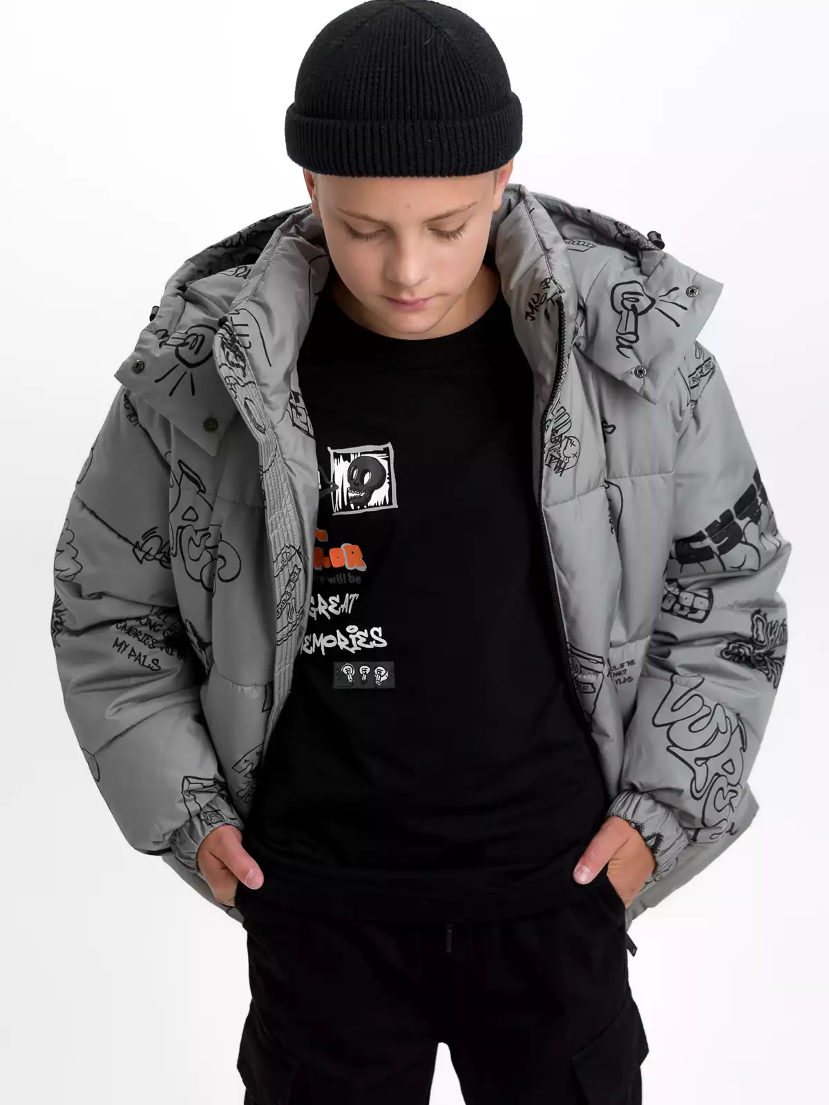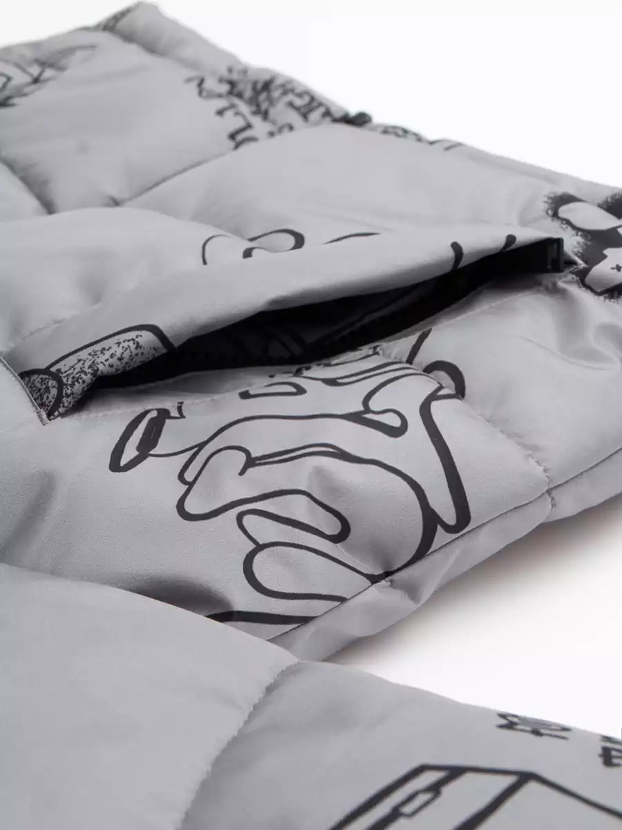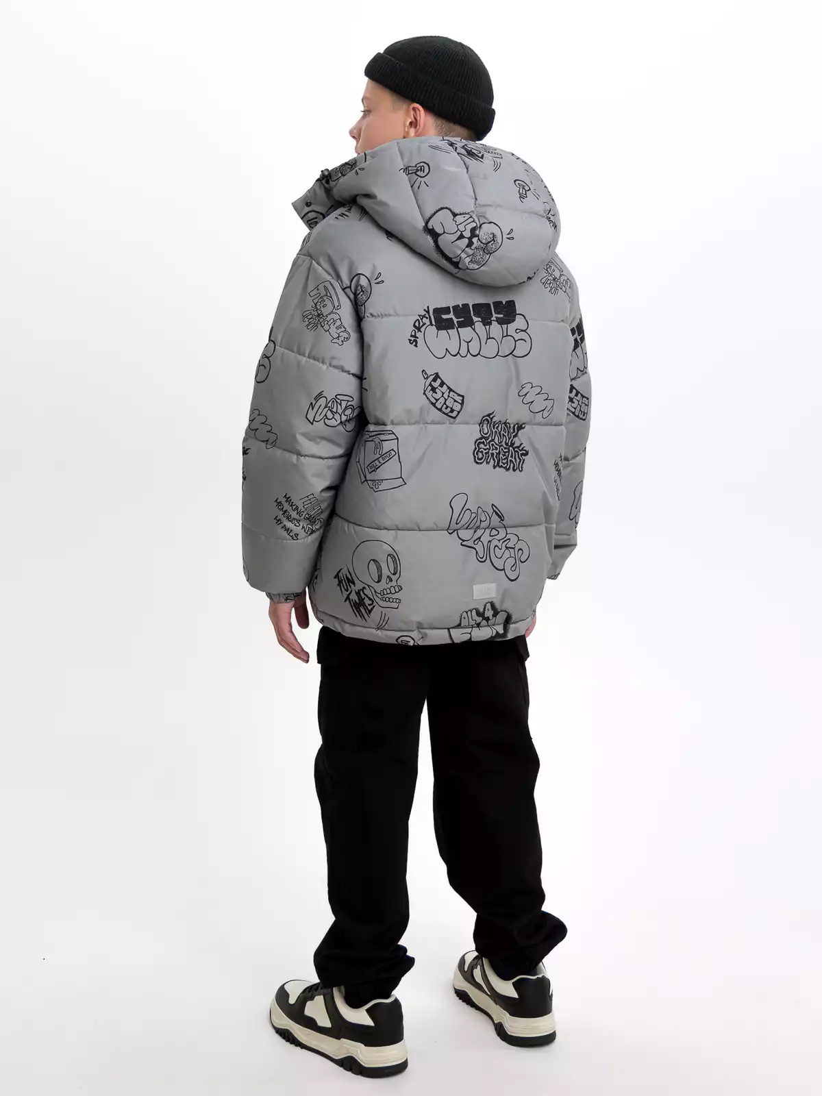 - Съёмный капюшон на кнопках с дополнительной фиксацией на кнопки в области горловины, по краю регулируемая утяжка на резину-шнур с фиксаторами;