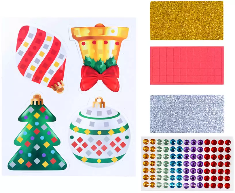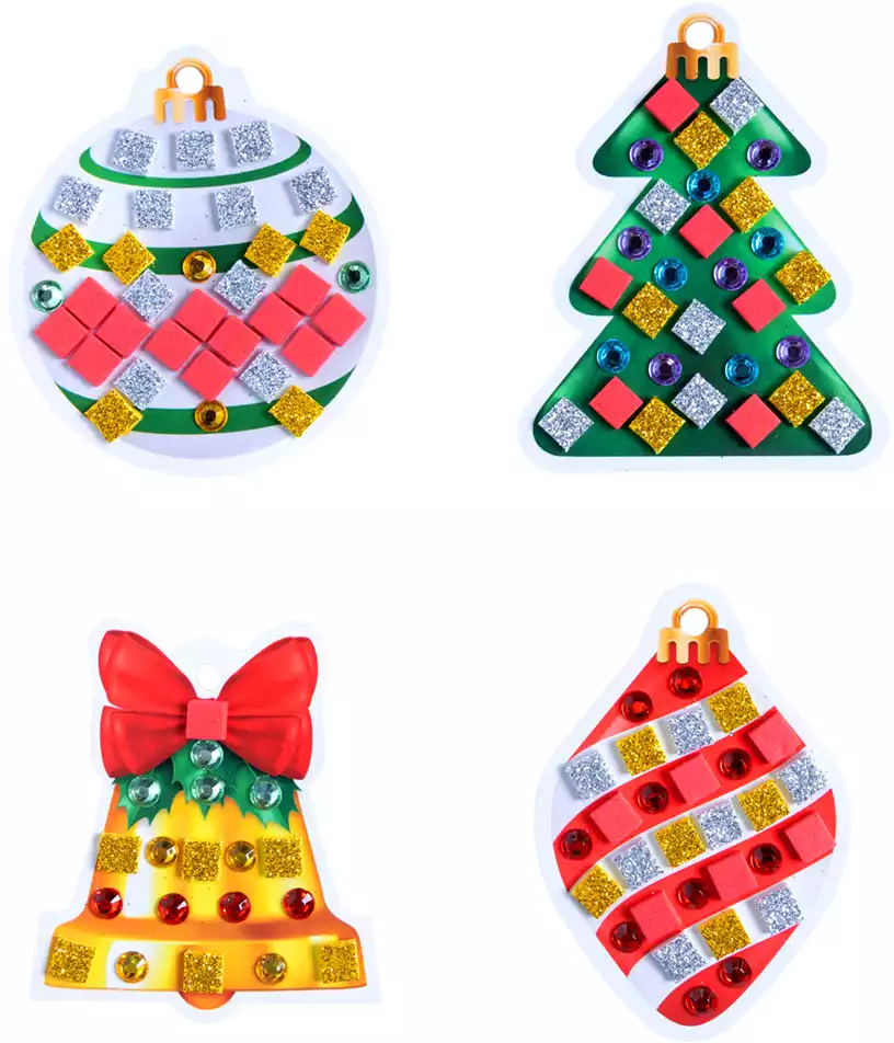Аппликация Ёлочные украшения состоит из 4 двусторонних цветных картонных игрушек в виде двух шаров разной формы, ёлки и колокольчика. Ребенку необходимо украсить их объемными самоклеящимися квадратиками и стразами. Этот процесс превосходно разовьет моторику неловких пальчиков и стимулирует творческие наклонности. Состав набора: