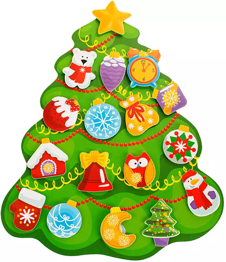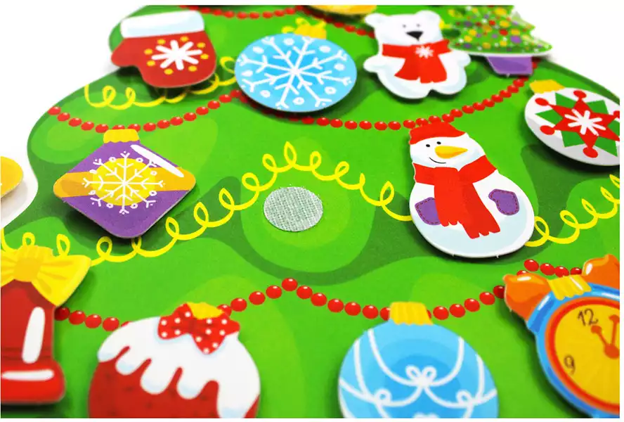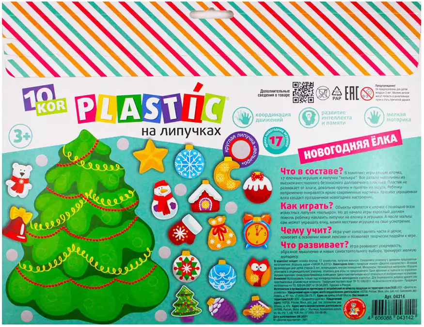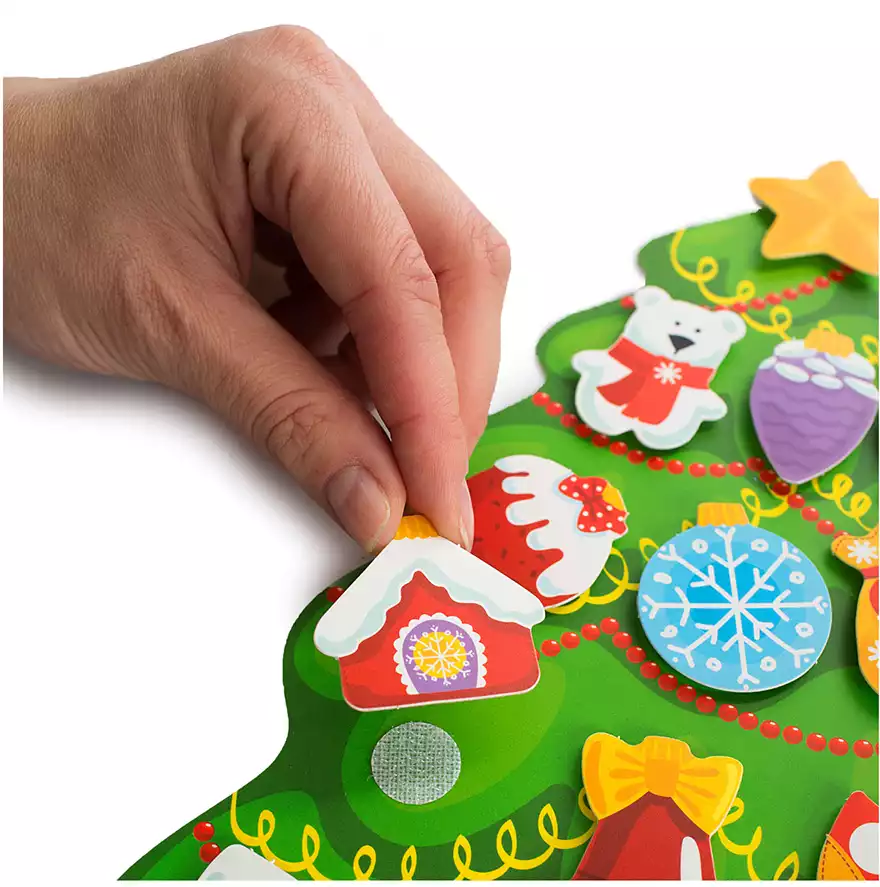 В корзинуРазвивайте творческие способности Вашего ребенка вместе с красочным набором Новогодняя ёлка на липучках. Украсьте ёлочку красочными новогодними игрушками и создайте праздничное новогоднее настроение! Состав набора: пластиковая основа-ёлочка (26,5х22,5 см) с напечатанным цветным рисунком – 1 шт; пластиковые плоские елочные украшения (4-4,5 см высотой) - 17 шт.; липучки - 18 пар.